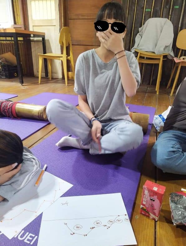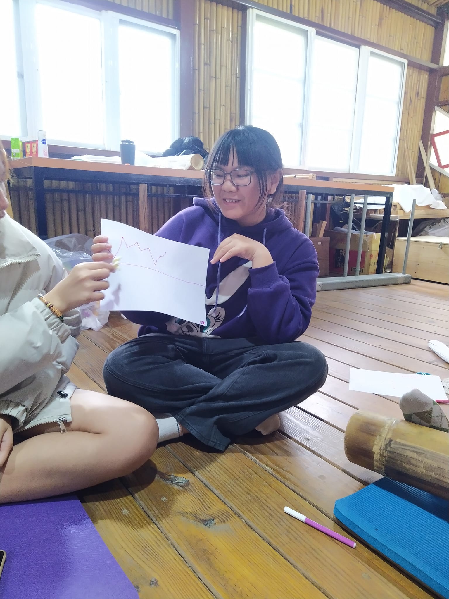 最後一天,依然用了社工人最愛的圍圈分享,讓女孩們畫下五天的心情曲線圖、聊聊最想對誰說的話。平常嘻嘻鬧鬧的毛孩子難得靜下來真情流露,除了謝謝Lawa老師辛苦的救布之外也把聽到的故事、閃過的小叮嚀都放在心上了,甚至還肯定異族的我織布教學的行動,讓女孩們有機會學習。
