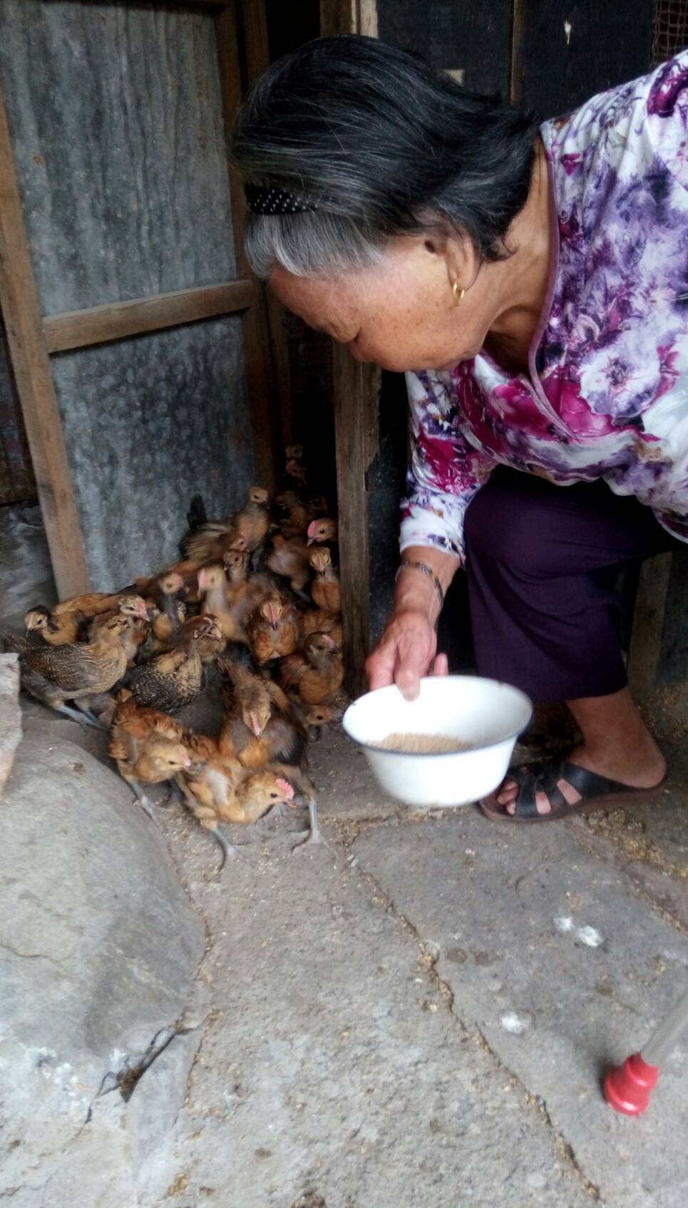 在阿嬤的細心呵護下,小雞逐漸長大,阿嬤說,聽到小雞們啾啾的聲音,就知道牠們餓了,阿嬤拄著拐杖慢慢打開雞寮時,小雞也會圍在阿嬤旁邊,期待豐盛的一餐 。有時小雞也會頑皮地飛到水槽或把粗糠踢進飼料槽中,阿嬤會像教導小孩般的訓斥小雞,當阿嬤述說小雞們不乖的模樣,表情是生氣又好笑,看著阿嬤比手畫腳地形容小雞頑皮模樣,似乎在飼養中看到阿嬤的活力與生活的動力,阿嬤對子女暖暖的愛,也在與小雞的互動中呈現