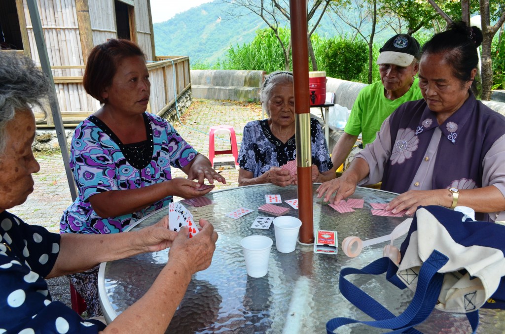 像園遊會一樣很多個攤位,讓yaki、yutas們可以選擇自己喜歡的地方,卡拉OK在竹屋裡,外面還有射山豬、跳棋、撲克牌、象棋、跳棋、兵乓跳跳球。一個小時的時間有些長輩每一個攤都有去、有先長輩獨愛撲克牌,四五個朋友坐在一桌打起牌聊聊天,有些長輩還認識了新的朋友,有些長輩不會玩撲克牌或不方便到處走來走去,這時移動式跳跳球就移到長輩面前,手丟球彈到地上在到分數箱裡,看似簡單實際下去試試看六顆還無法全數達陣,但還真的有長輩可以,還會叫旁邊的yaki快來玩。射箭時有一位yutas特別厲害,眼神之專著每發必中,原來年輕時的他也會用弓箭、彈弓打獵,但旁邊的yaki也不惶多讓說著自己第一次玩,但卻一下子就射到山豬板子。卡拉OK向來都是長輩最愛,一首接一首的歡唱。